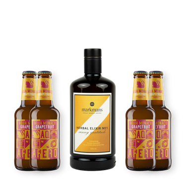 Set für einen kräuterfrischen Paloma-Highball aus Markmans Herbal Elixir No 1 & Aqua Monaco Grapefruit.