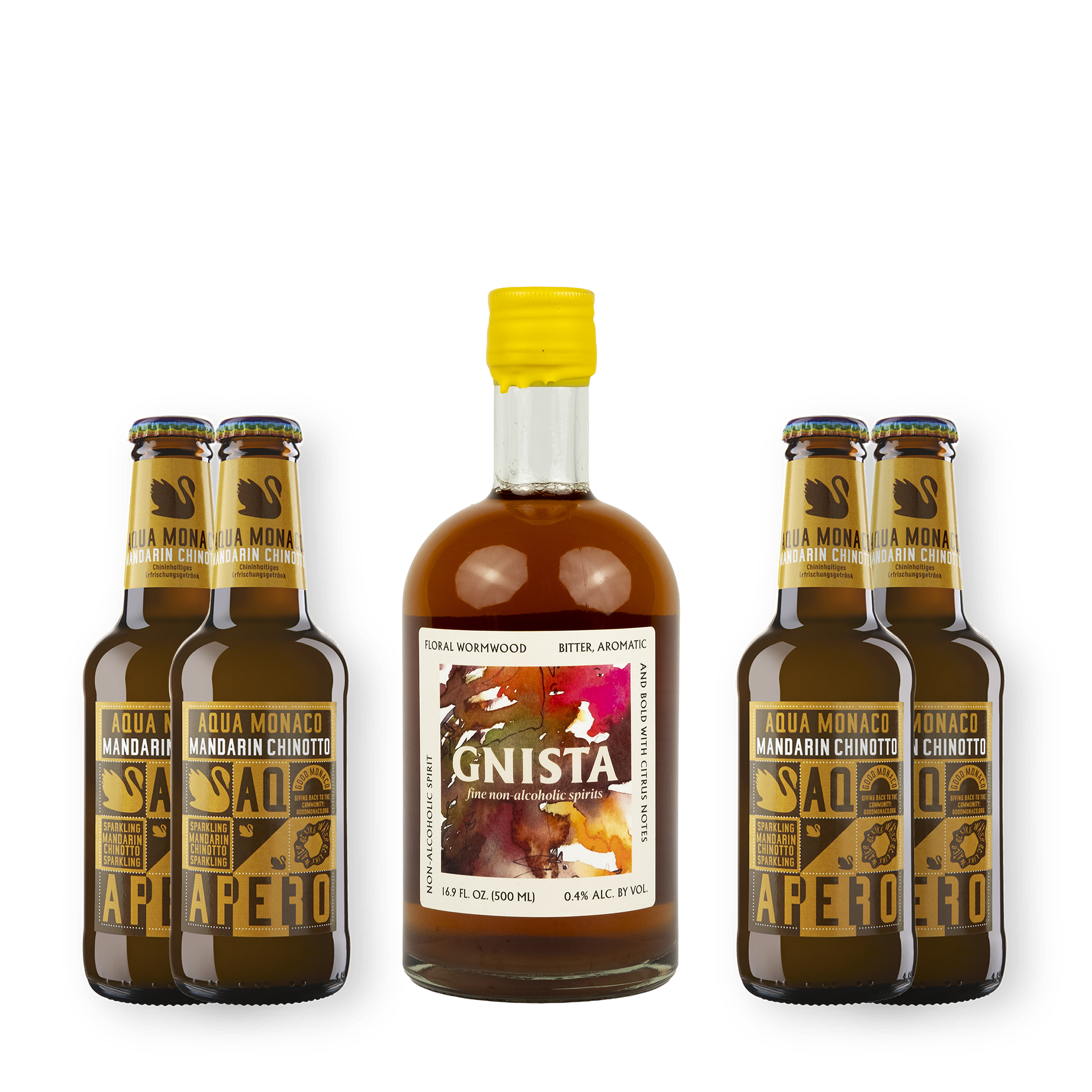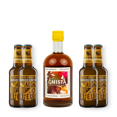 Set für einen zitrusfrischen Spritz aus Gnista Floral Wormwood und Aqua Monaco Mandarin Chinotto.